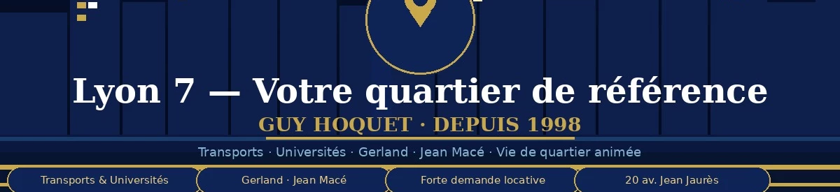 Vous avez un projet d'achat immobilier dans le quartier Jean Jaurès à Lyon 7 ? Ne perdez plus de temps et prenez contact avec votre agence Guy Hoquet Lyon 7. Commencez par une estimation gratuite de votre bien ou consultez directement nos annonces de biens à vendre à Lyon 7. Vous pouvez aussi explorer nos guides : acheter et vendre dans le 7ème en 2026 · gestion locative à Lyon 7. Nos conseillers sont disponibles au 04 72 76 70 80, du lundi au samedi.